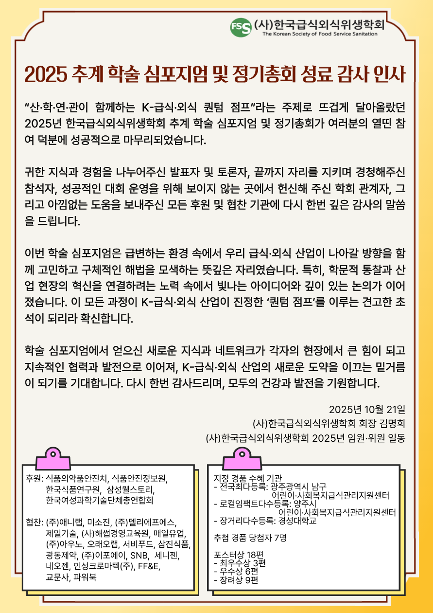 한국급식외식위생학회(이하 ‘학회’) 는 귀하의 개인정보보호를 매우 중요시하며, 『개인정보보호법』을 준수하고 있습니다. 학회는 개인정보처리방침을 통하여 귀하께서 제공하시는 개인정보가 어떠한 용도와 방식으로 이용되고 있으며 개인정보보호를 위해 어떠한 조치가 취해지고 있는지 알려드립니다.